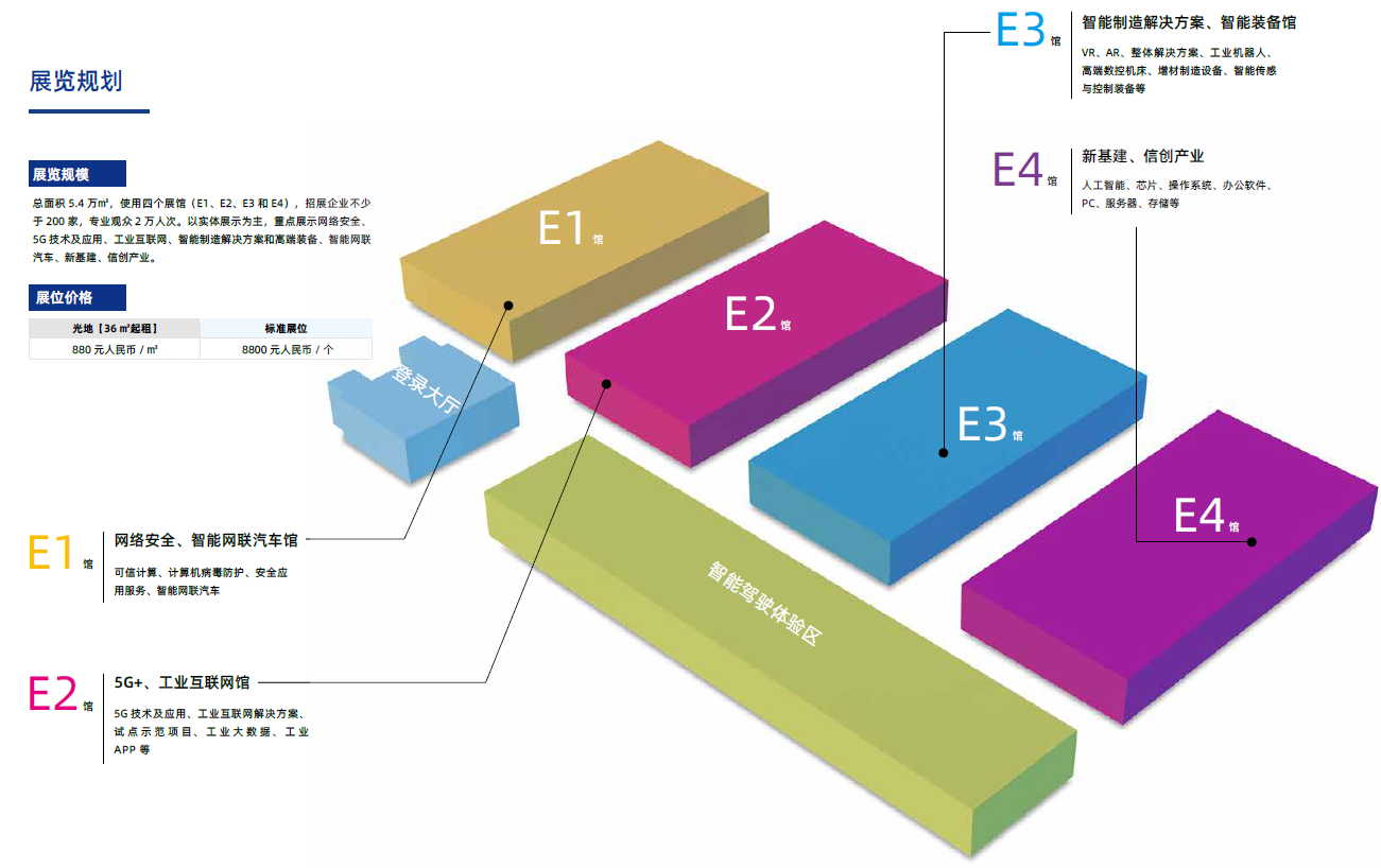 規模:總面積5.4萬㎡,計劃使用四個展館(E1、E2、E3和E4),計劃招展企業不少于200家,專業觀眾2萬人次。以實體展示為主,重點展示網絡安全、5G技術及應用、智能裝備、智能網聯汽車、智能終端及芯片。